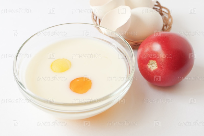 Два яйца в миске с молоком и помидор на белом фоне