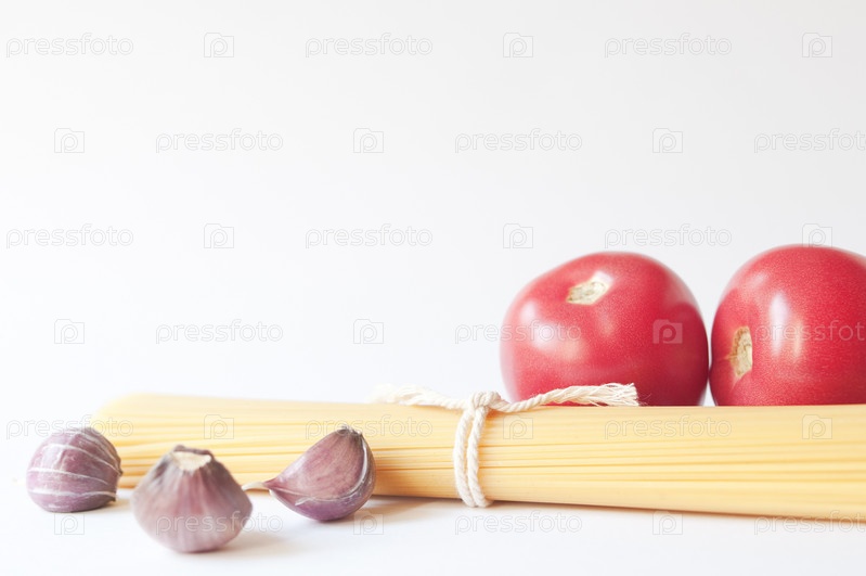 Спагетти, помидоры и чеснок на светлом фоне