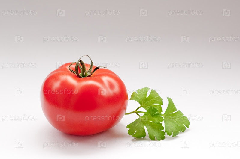 Помидор и веточка петрушки на сером градиентном фоне