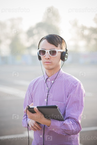 Молодой азиат с планшетом и в наушниках