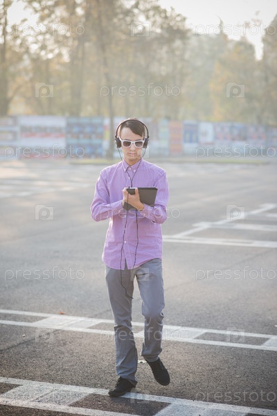 Молодой азиат с планшетом и в наушниках