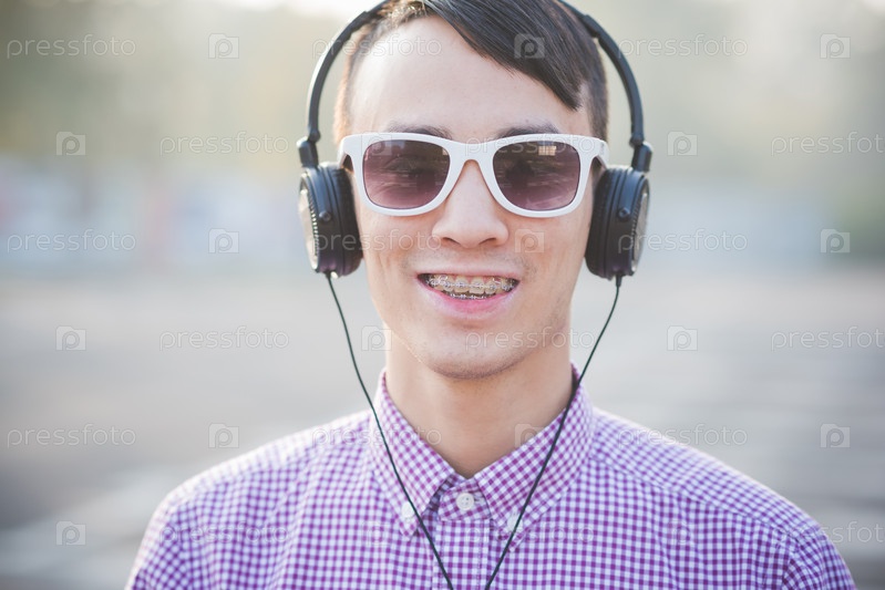 Молодой азиат с планшетом и в наушниках