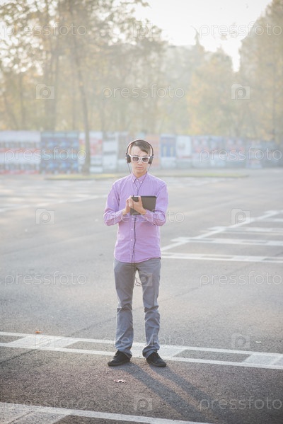 Молодой азиат с планшетом и в наушниках