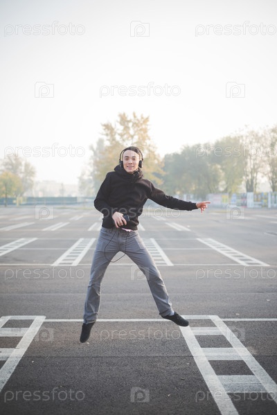 Молодой азиат с планшетом и в наушниках