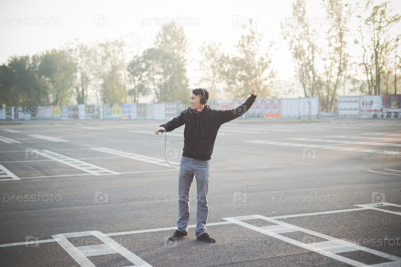 Молодой азиат с планшетом и в наушниках