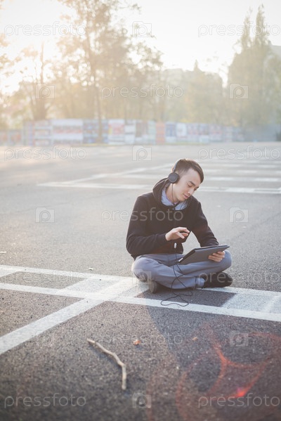 Молодой азиат с планшетом и в наушниках