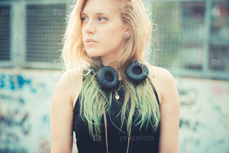 Красивая молодая блондинка слушает музыку