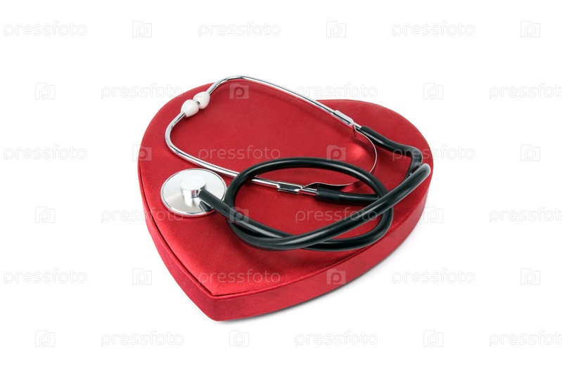 Стетоскоп и коробка в форме сердца на белом фоне