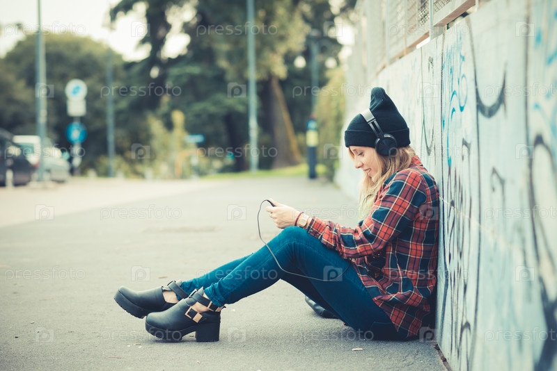 Красивая молодая блондинка слушает музыку