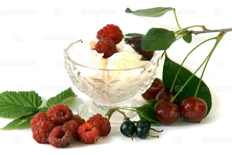 Взбитые сливки с ягодами на белом фоне