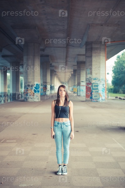 Молодая красивая брюнетка слушает музыку