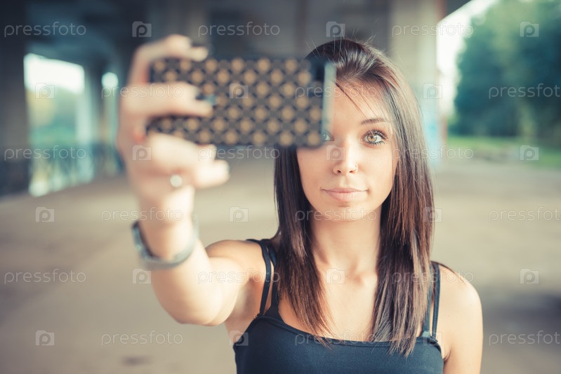 Молодая красивая брюнетка со смартфоном