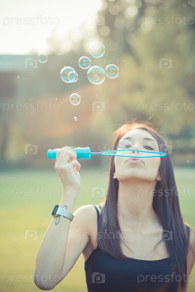 Красивая брюнетка пускает мыльные пузыри