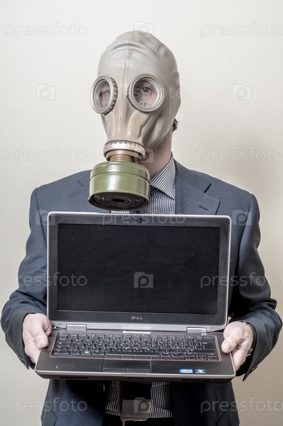 Бизнесмен в противогазе с ноутбуком