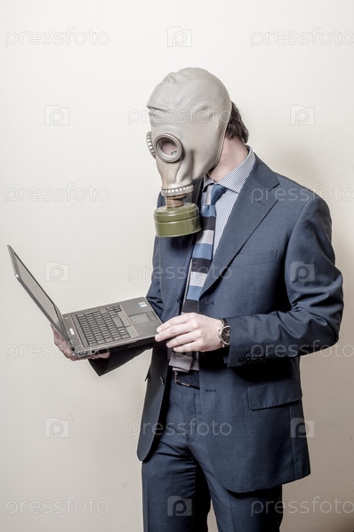 Бизнесмен в противогазе с ноутбуком