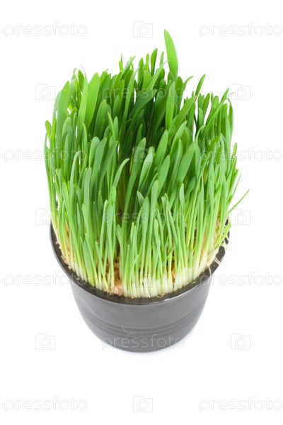 Зеленая трава в горшке на белом фоне