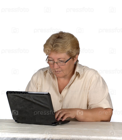 Пожилая женщина работает на ноутбуке