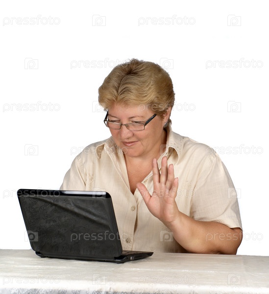 Пожилая женщина работает на ноутбуке