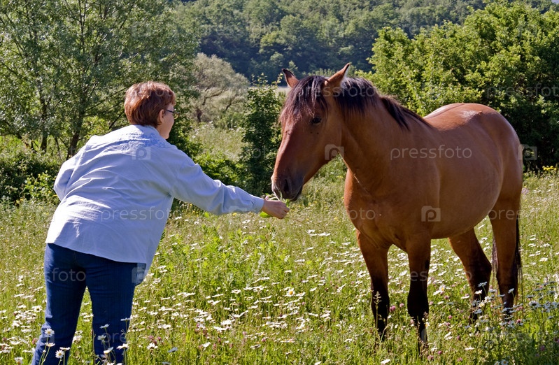 Женщина кормит лошадь на лугу