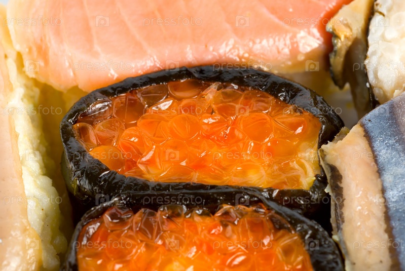 Вкусные свежие японские суши с икрой