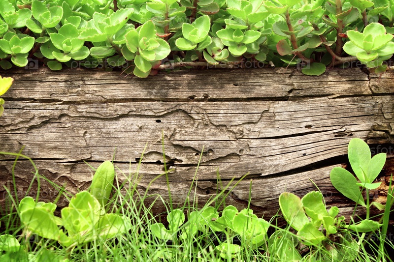 Летний фон со старой деревянной доской, травой и зелеными листья