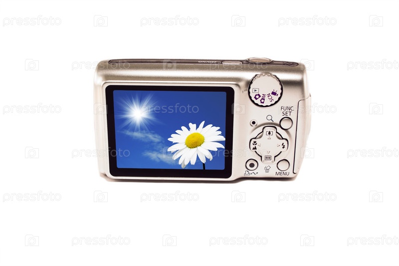Цифровая камера с изображением ромашки на экране, изолировано на белом фоне