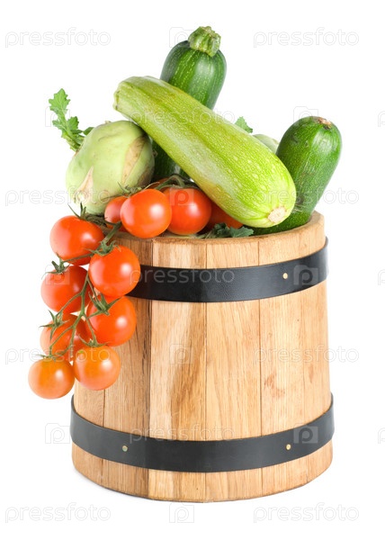 Деревянная бочка с овощами, изолирована на белом фоне