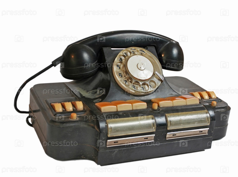 Антикварный старинный черный телефон с дисковым набором 19-го века на белом фоне