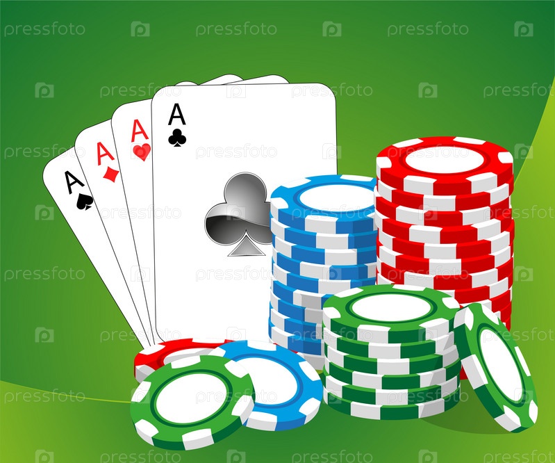 Фишки и игральные карты на зеленом фоне