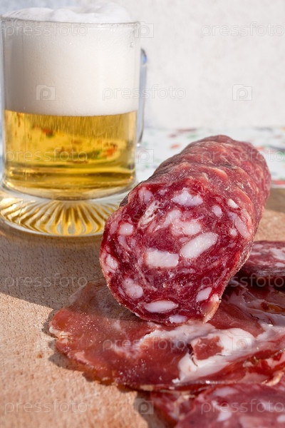 Нарезанная итальянская колбаса и кружка пива