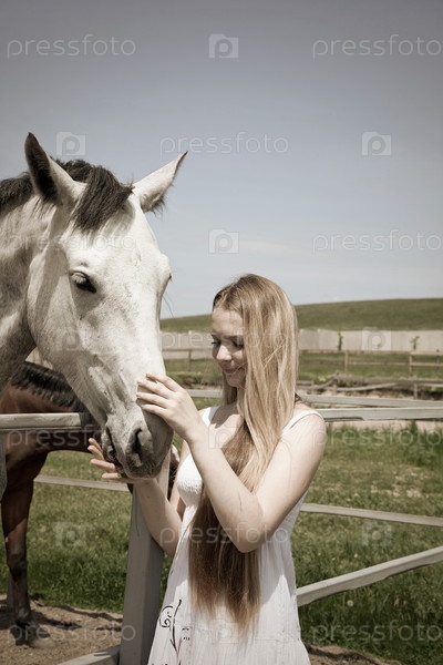 Портрет привлекательной девушки с белой лошадью