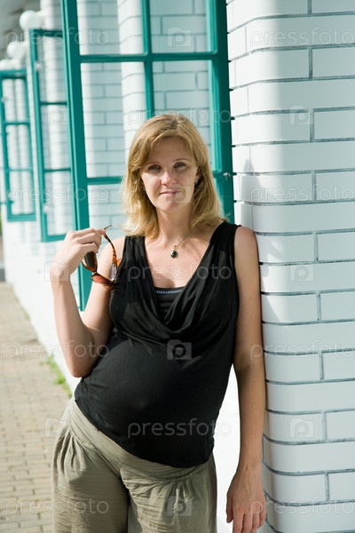 Беременная женщина стоит возле белой кирпичной стены