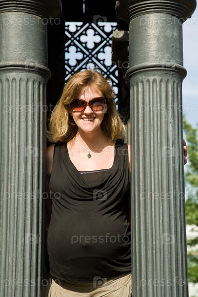 Беременная женщина в солнцезащитных очках рядом с колоннами