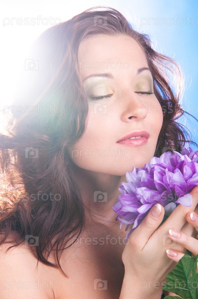 Портрет красивой молодой девушки с цветами на голубом фоне