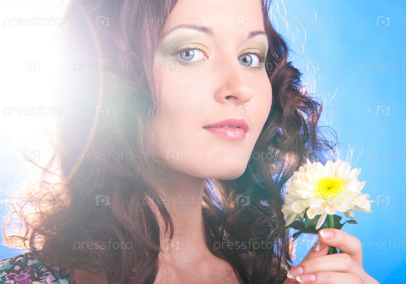 Портрет красивой молодой девушки с цветами на голубом фоне