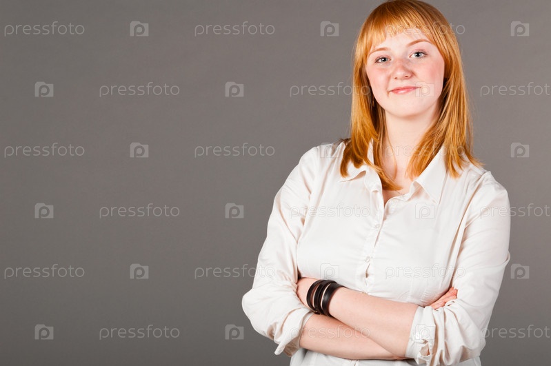 Улыбающаяся девушка в рубашке на сером фоне
