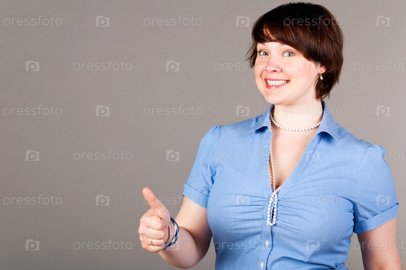 Улыбающаяся девушка в рубашке на сером фоне