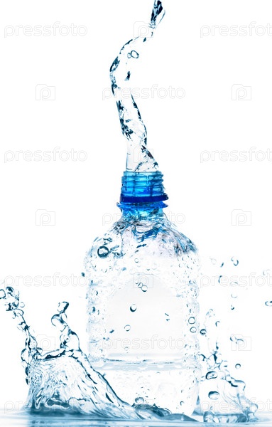 Брызги воды из бутылки крупным планом на белом фоне