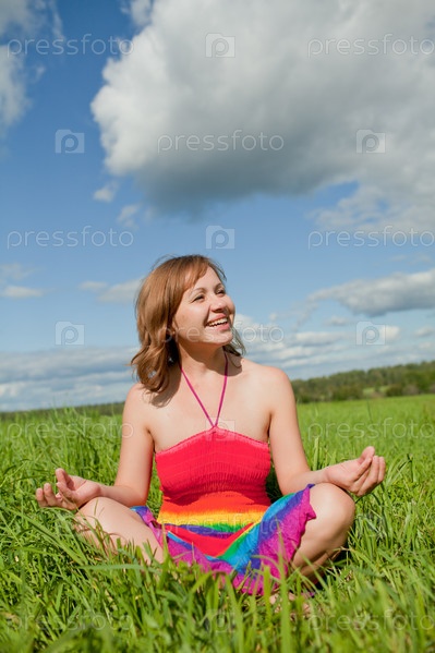 Девушка сидит на траве в позе лотоса
