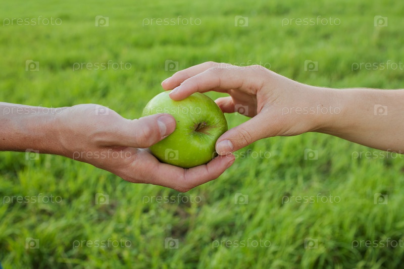 Руки, держащие яблоко на фоне травы