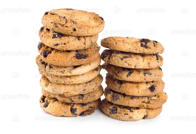 Стопки шоколадного печенья на белом фоне