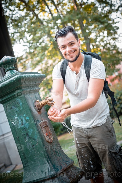 Стильный мужчина у питьевого фонтана