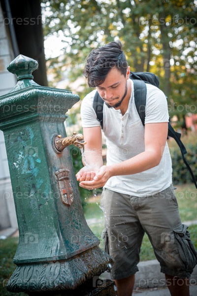 Стильный мужчина у питьевого фонтана