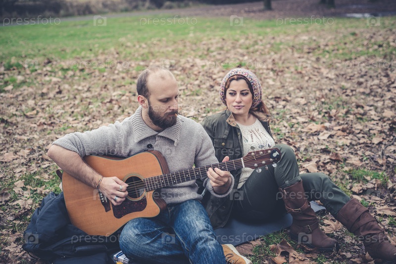 Мужчина играет женщине на гитаре
