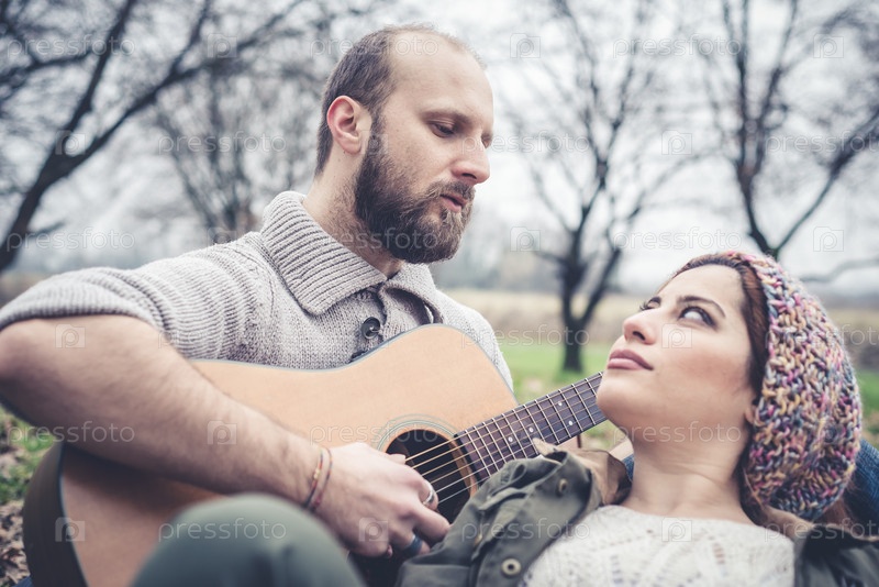 Мужчина играет женщине на гитаре