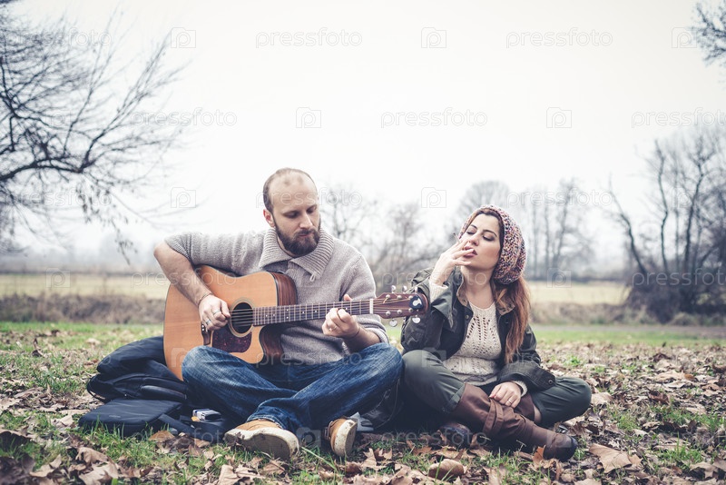 Мужчина играет женщине на гитаре