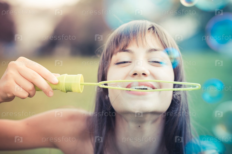 Красивая молодая женщина пускает мыльные пузыри