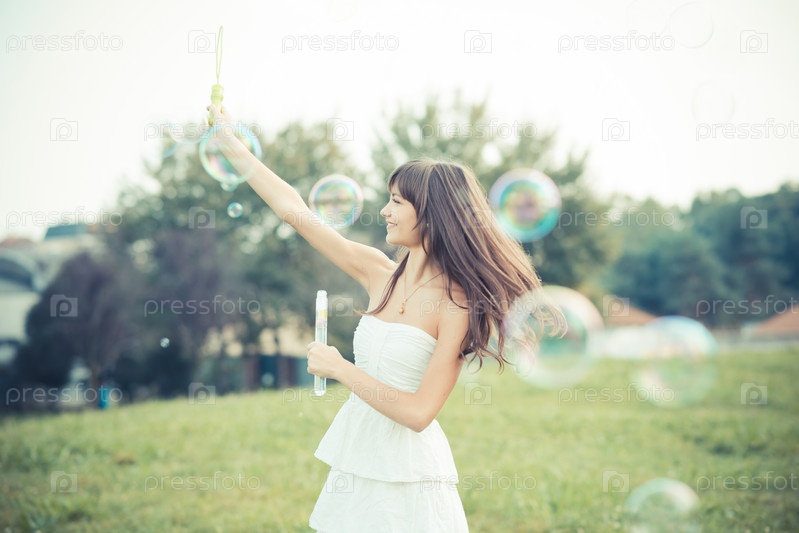 Красивая молодая женщина пускает мыльные пузыри