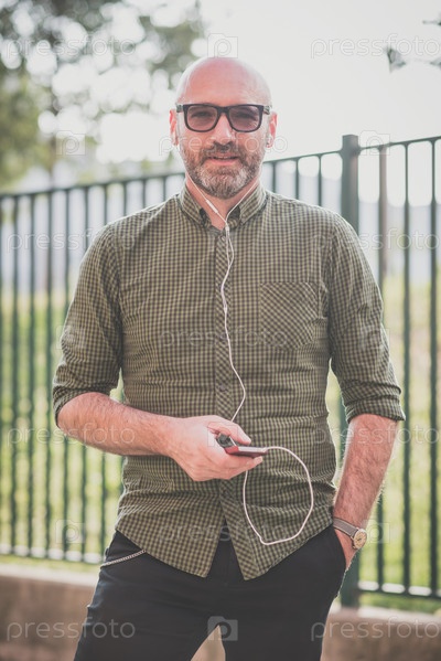 Мужчина среднего возраста слушает музыку