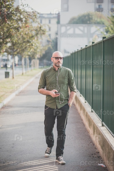Мужчина среднего возраста слушает музыку